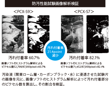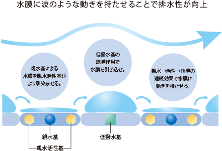 被膜の緻密さを向上させることで汚れの固着を防ぐとともに、親水基と親水活性基を交互に被膜上に整列させ、低撥水基をブレンド。