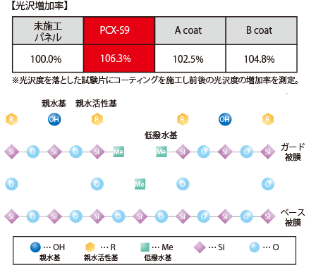 PCX-S9は、被膜構造内に光沢付与効果を持つ低撥水基を結合させたことで、深くそして鮮やかな艶を演出し、透明感溢れるボディを創りだします。