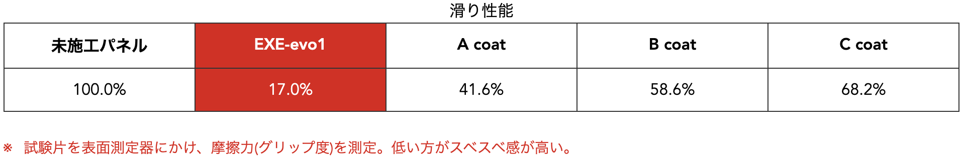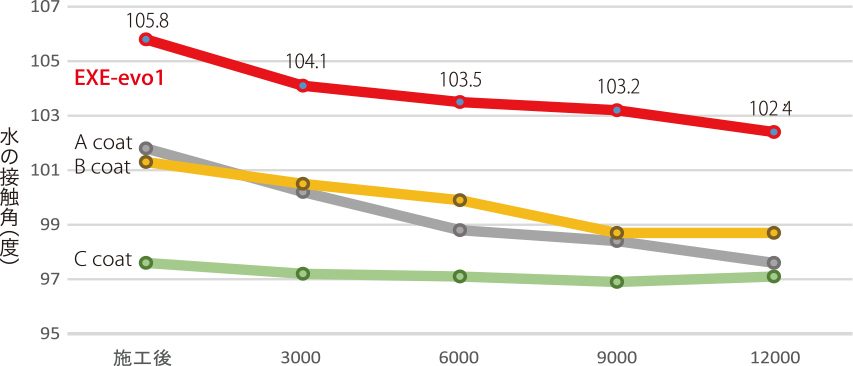 ベースコートのシリコーンレジンやトップコートの保護ポリマーは成分中のメチル基の配向により美しく強力な撥水状態を作りだします。撥水状態持続性を調べるためにシャンプーとスポンジを使った摩擦耐久試験では3,000サイクル(往復)ごとに水玉の接触角を測定。12,000サイクルの洗浄後の接触角は102.4度、わずか3.2度の減少となり、同様に測定した他のコーティング剤の初期値も上回り、撥水持続性の優れている性能を実証。さらに表面の手触り感はツルツルスベスベでしなやかな感性を刺激します。
