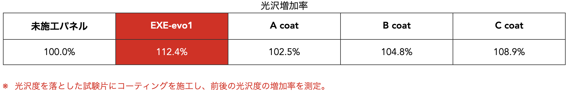 「EXE-evo1」は結合力が強い2種類のガラス質成分を2度に分けて丹念に施工することで、その美しい艶感・膜厚感は長期間にわたって持続。